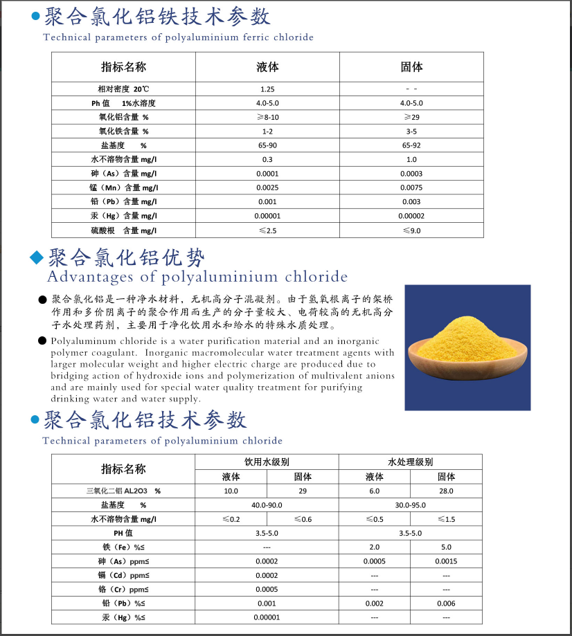 產(chǎn)品介紹 聚合氯化鋁(PAC)是一種無機物,一種新興凈水材料、無機高分子 混凝劑,簡稱聚鋁。對水中膠體和顆粒物具有高度電中和及橋聯(lián)作用,并可強力去除微有毒物及重金屬離子,性狀穩(wěn)定